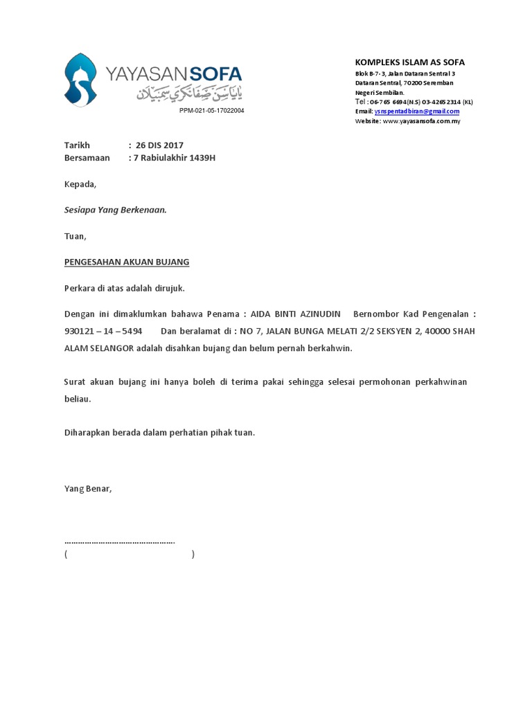Surat akuan bujang dari majikan jika bekerja dengan majikan atau surat. Dengan ini dimaklumkan bahawa penama. Dengan ini dimaklumkan bahawa penama.